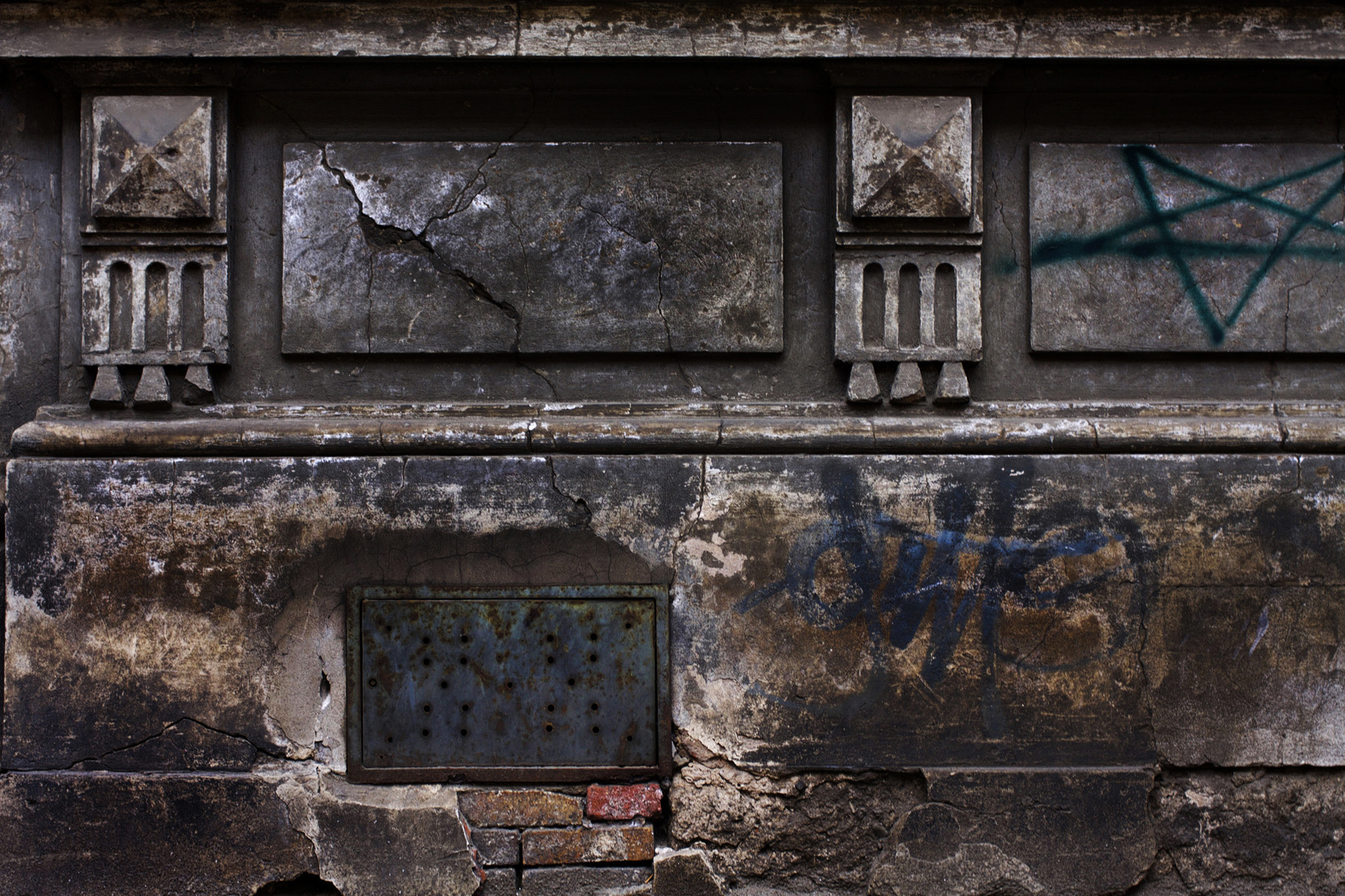 “Spatial as well as surface tactile. Fascinated randomness. The human figure appears as a singular frozen device. Post-apocalyptic as well.”